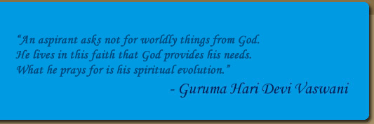 It was the tranquil hour of eve; the mystical glow of the setting sun enveloped the earth and adorned it with its heavenly hues. Temple bells rang at a distance. The devout put aside their chores and lifted their hearts in prayer to the Lord. It was at this serene hour that the world was blessed with the birth of a divine soul, the pious mother --Ma Haridevi P. Vaswani.